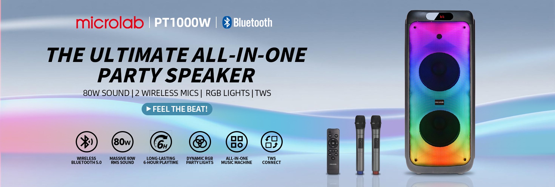 Microlab 무선 무선 블루투스 파티 스피커 박스 PT1000W (무선 마이크 FM 라디오 듀얼 10 인치 서브 우퍼 포함)