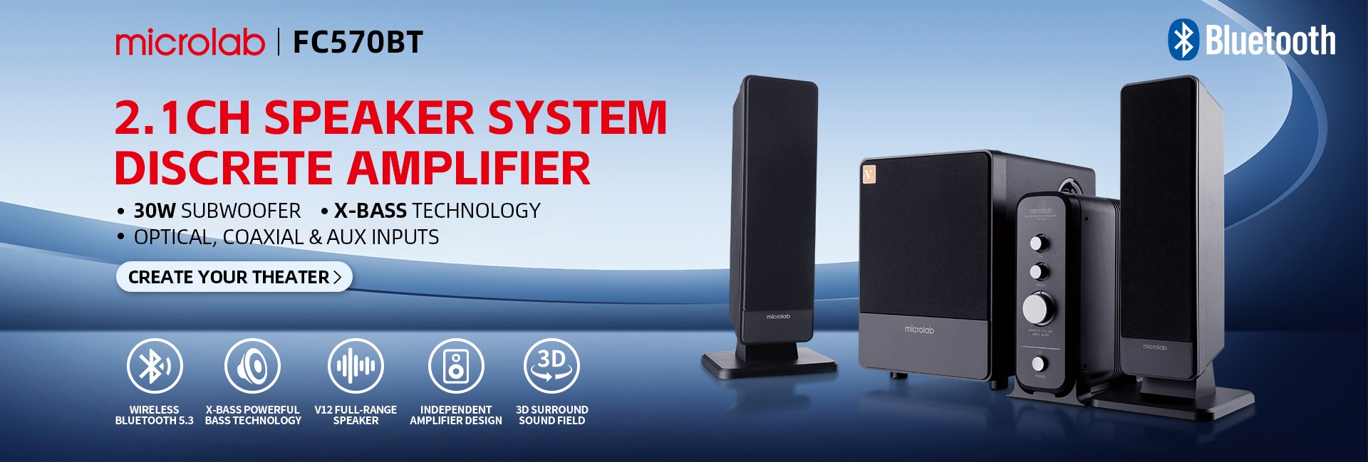 Microlab FC570BT 2.1CH 하이파이 오디오 시스템 이산 증폭기 서브 우퍼 광학/동축 입력 용 플라스틱 홈 데스크탑